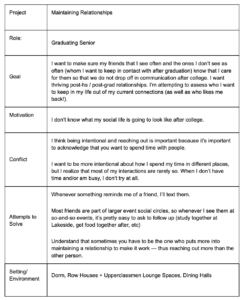 Graduating Gracie is a college senior who worries about the state of her social relationships upon graduating. She’s very conscious of her current friends and has been thinking about intentionality with them for a while, especially since she wants others to know that she’ll be there for them and still appreciates them even when they’ll be in different parts of the country. Most of her interactions are intentional and with friends she hasn’t seen in a while as an effort to catch up with different parts of her social circle.