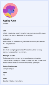 The second persona I created is Active Alex: Active Alex is a busy student who wants to maximize her small chunks of time in creating meaningful social interactions. She is initiates interactions whenever she sees a chance.