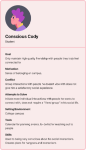 Our group is focusing on the issue of maintaining relationships (mainly friendships). I created two persona out of our interviewees: Conscious Cody and Active Alex. Conscious Cody really values high quality interactions and deep connections in his friendships. Instead of staying in groups where he doesn’t feel connected to everyone, he would rather initiate individual interactions with friends he value.
