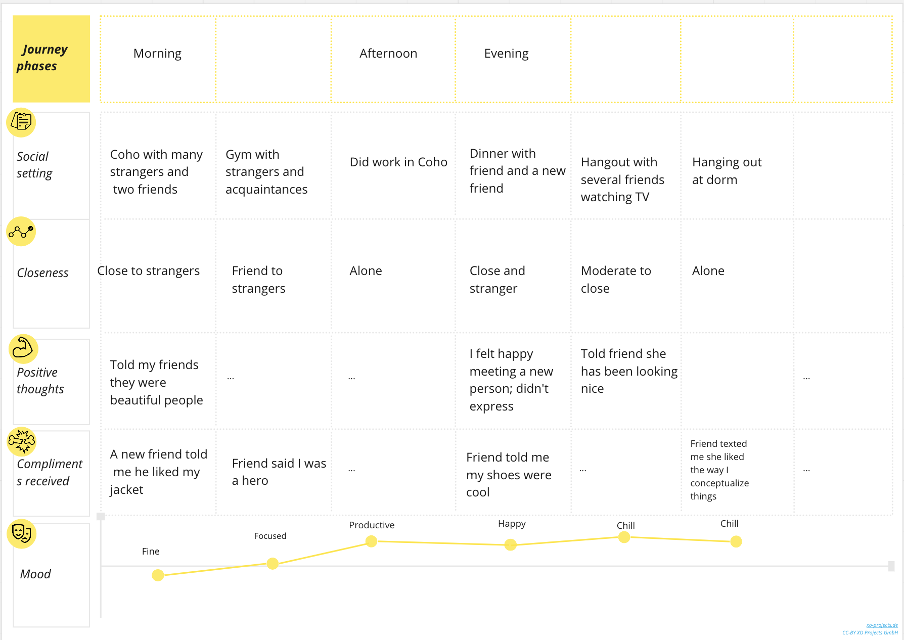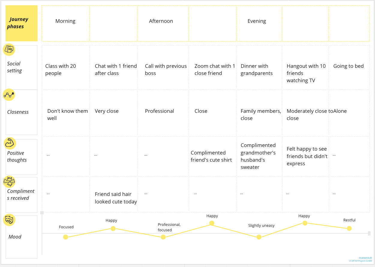 I created two user profiles and corresponding journey maps based on data we collected during our baseline study. Our team is focusing on the behavior of giving compliments. We’d like to increase the number of compliments people give and get. My first persona is someone who feels uncomfortable getting compliments. My second persona is someone who loves giving out compliments to build her relationships but isn’t always sure when it’s appropriate. We collected data during our study on compliments given/received and also the social situations the participant was in throughout the day. I used the social situation information to build journey maps of where each person was socially and when/if they gave and received compliments. We have seen that the social environment (number of people, closeness, formality) has a big effect on the compliments that are given out, which is why I structured the journey maps this way. I chose to focus one user profile on someone who has a perceived issue with receiving compliments, and the other on someone with an issue related to giving compliments, in order to provide a look at both potential sides of the behavior change.