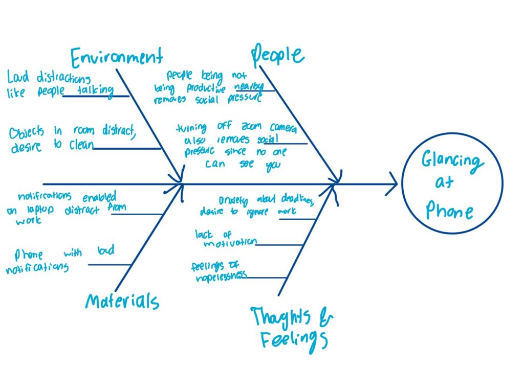 - Mindset: The primary cause of my desire to look at my phone was not being in a good mindset. Not having a structured plan of how to approach work, anxiety from approaching deadlines, and feelings of hopelessness all led to a lack of motivation. This lack of motivation made me want to look at my phone. I also had a restlessness towards working, and I would want to look at my phone to avoid doing work.