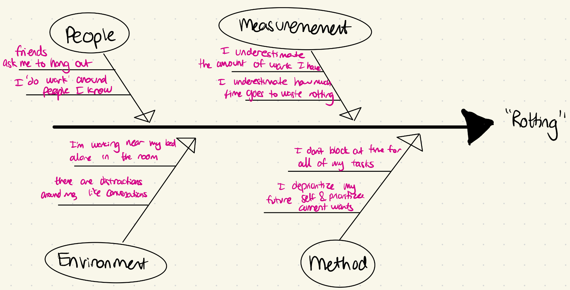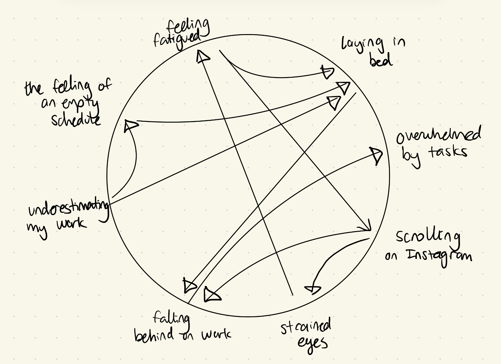 Below, I’ve drawn a connection circle that shows that several types of rotting (including laying in bed and scrolling on instagram) are connected to causes like underestimating my work, feeling like I have an empty schedule, etc. These causes are also related to each other.