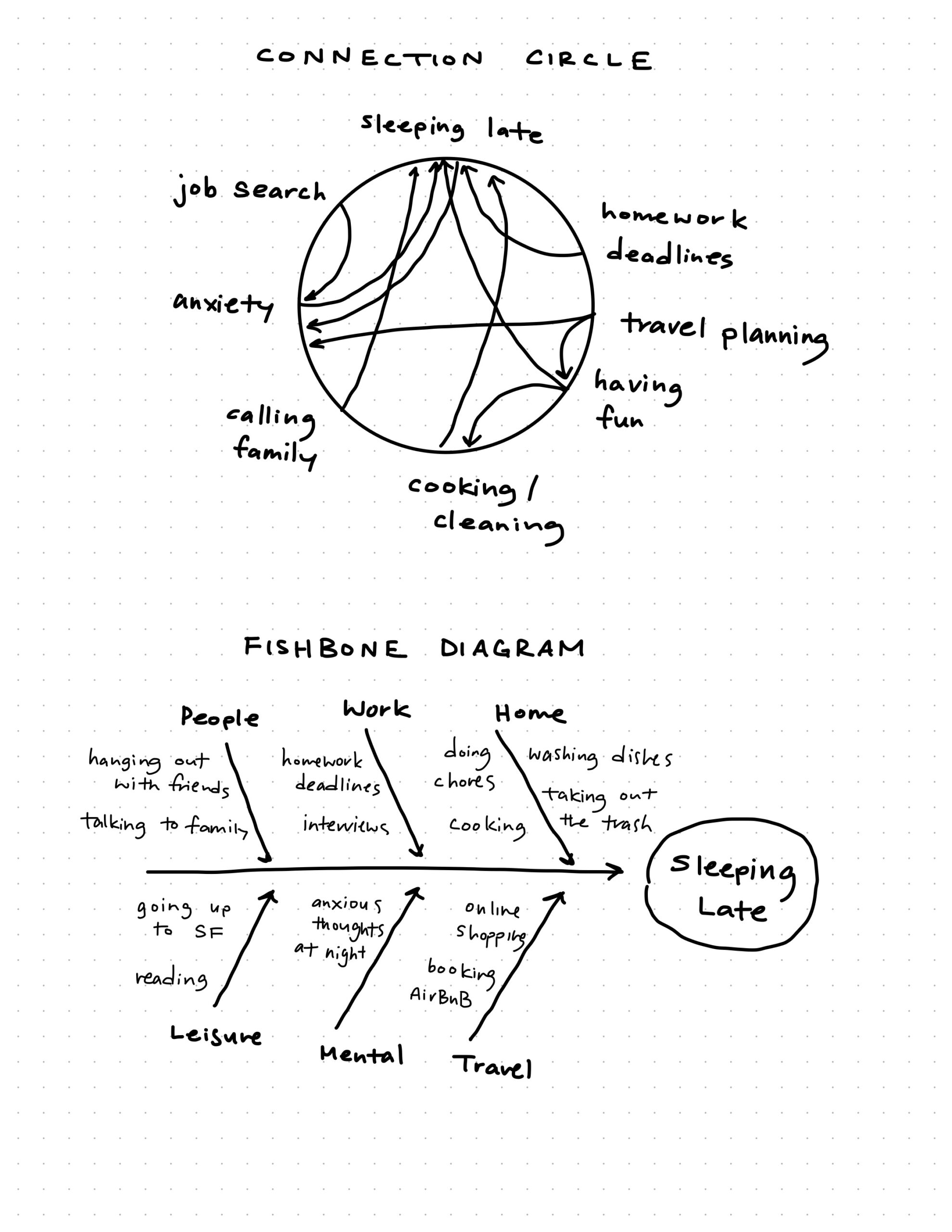 In order to dissect the causes for sleeping late, I created a connection circle and a fishbone diagram. The fishbone diagram helped me to enumerate and categorize all the potential causes for sleeping late, while the connection circle allowed me to draw causal links between different causes and see which causes might me the leading culprits.