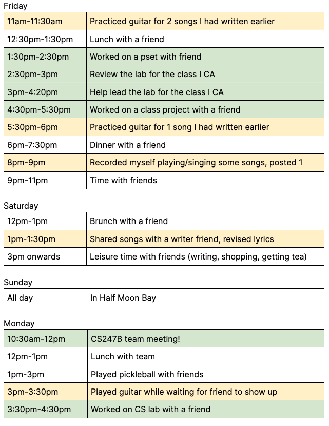 I initially tried writing something down every hour, but found that there were nuances within those hours or multiple hours with the same activity that was unrelated to my chosen habit. And so, I changed it to an approach that Krishnan mentioned in class that focused on the key events. After looking at these key events, I grouped them into 3 categories: time spent on my behavior is highlighted in yellow, working on class or homework matters is highlighted in green, and social or leisure time is left in white. Below is my log from last Friday to Monday: