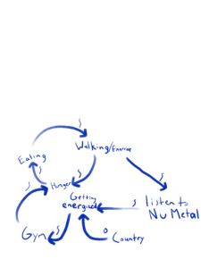 A feedback loop I found was how the kinds of music I listened to interacted with my eating and exercise cycle. For both days after eating lunch I walked around Lake Lag to digest. During these walks I enjoyed listening to high energy music. Nu Metal music was in rotation during this time. I would then get energized by the high energy music leading me to go to the gym. I would comeback to my room and after some tasks I would get hungry once more and eat. The only negative input would be Country music as it is more mellow and low energy.