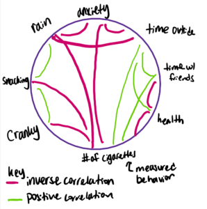 I tracked the amount of cigarettes I smoked over the past three days (Saturday to Monday). I quickly noticed a big decline from my smoking habits prior to the start of this tiny study to when it actually started on Saturday. I attribute this pre-study change to a new critical awareness of my smoking and my change in environment. This new “focus” or “hyperawareness” I was putting on my smoking caused me to ask myself if I was being excessive and over indulgent with the number of cigarettes I smoked. I feel I was also more open to asking myself those questions because weather conditions made the act of smoking less enjoyable. My friends who smoked were also less likely to already be smoking or interested in smoking if the weather conditions were miserable. I saw myself smoking less but experiencing minor withdrawal symptoms like headaches more often. I got cravings more often so in the end I smoked less each time I went out to smoke but went out to smoke more often. Some of my results are represented in the below connection circle and feedback loop.