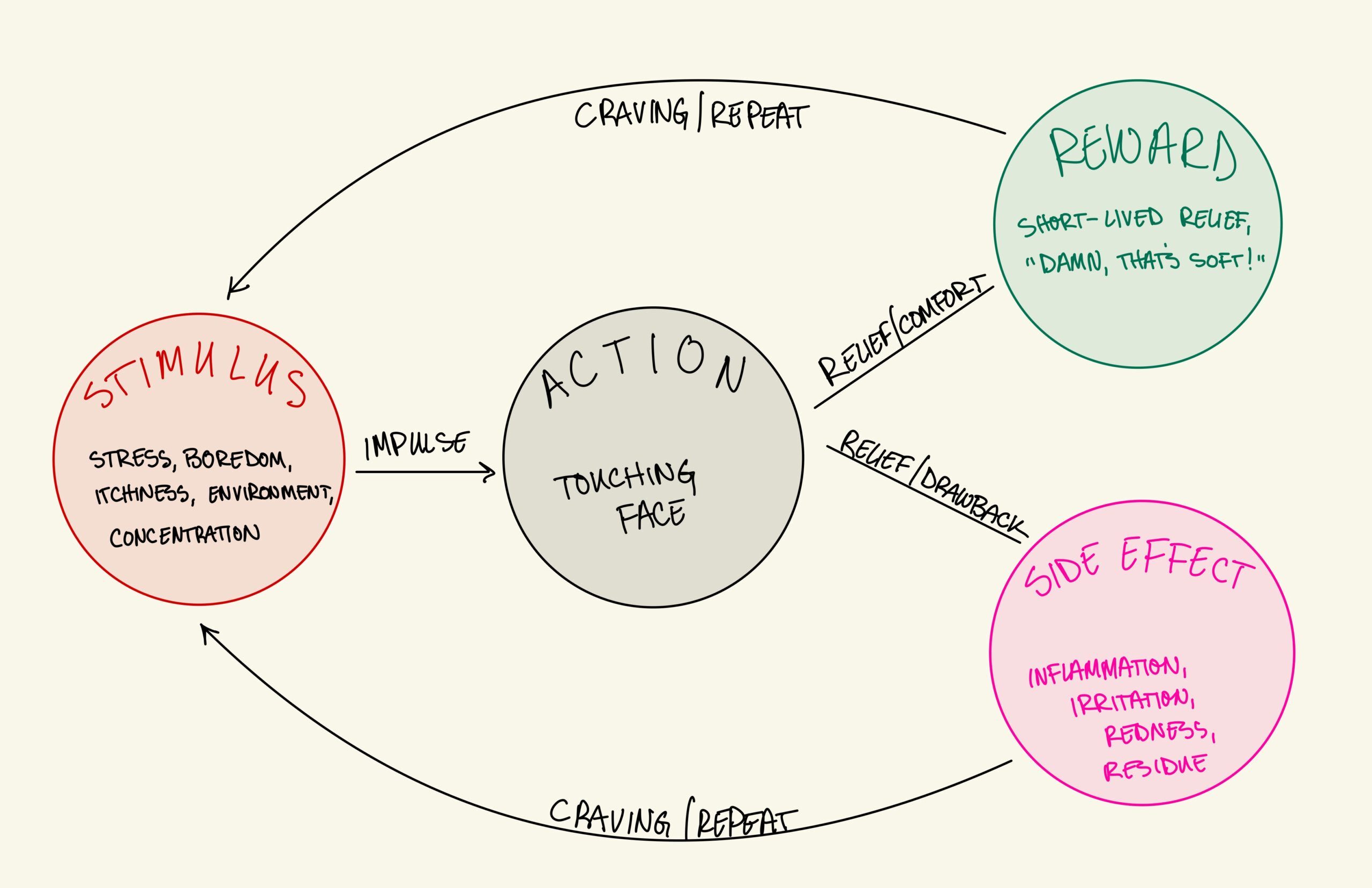 Though face-touching eases some stress or environmental discomfort, it has two effects. First, I feel the reward of smooth skin and a sense of grounding in my body. Second, I am reminded that overdoing this action really does mess up my skin, no matter how much I exfoliate at the end of the day. For now, I am glad I have formalized my reasoning for this action, and I hope to wean myself off this habit in the future.