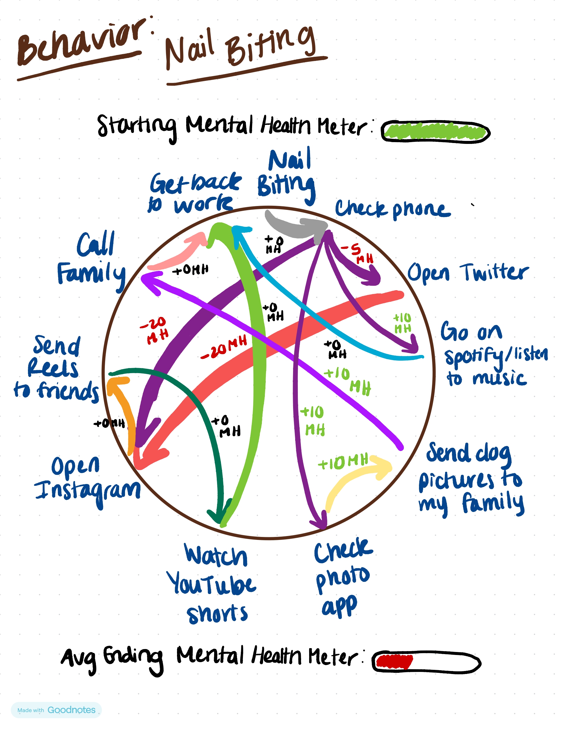 The habit I decided to track for this assignment was one of the bad habits I have had since I was young: biting my nails. Over the years, the reasons why I have started biting my nails after a period of not biting them has changed, however, they usually all tie back to stress. For this assignment, I decided to track this behavior over the course of three days to see if there was anything in particular that was causing me to revert back to this habit. I decided to log what I was doing every 25-30 minutes, since I noticed that I spent quite a bit of time doing the same thing last time; a longer time interval would still be able to encapsulate what I was doing accurately.