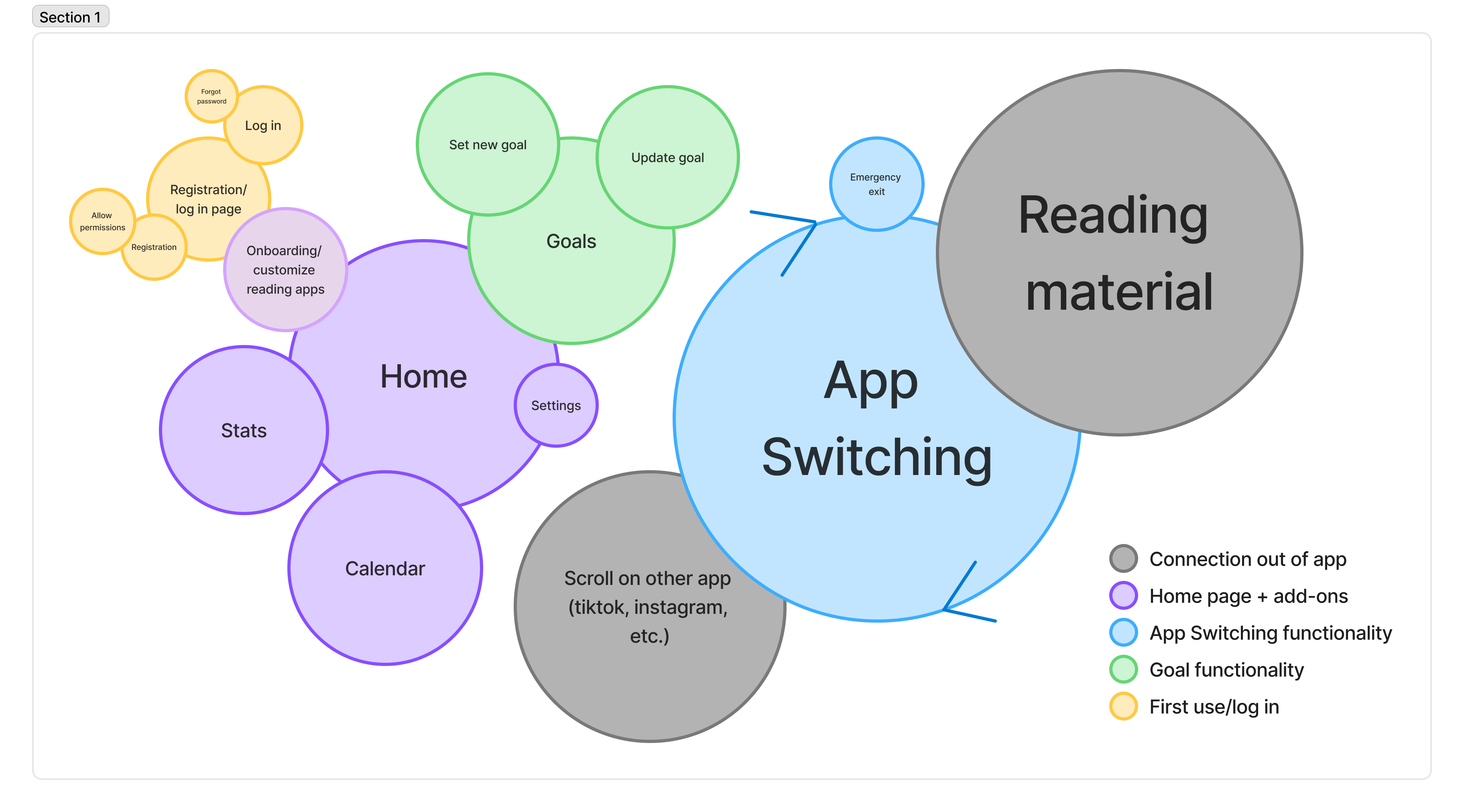 For our “app switcher” side, our individual bubble maps showed that there is a cyclical nature to that function, which we reflected in the synthesis. This is also where the connection to other apps happens, cycling between the vice of choice (TikTok, Instagram, Candy Crush, etc.) and the reading material previously customized by the user.