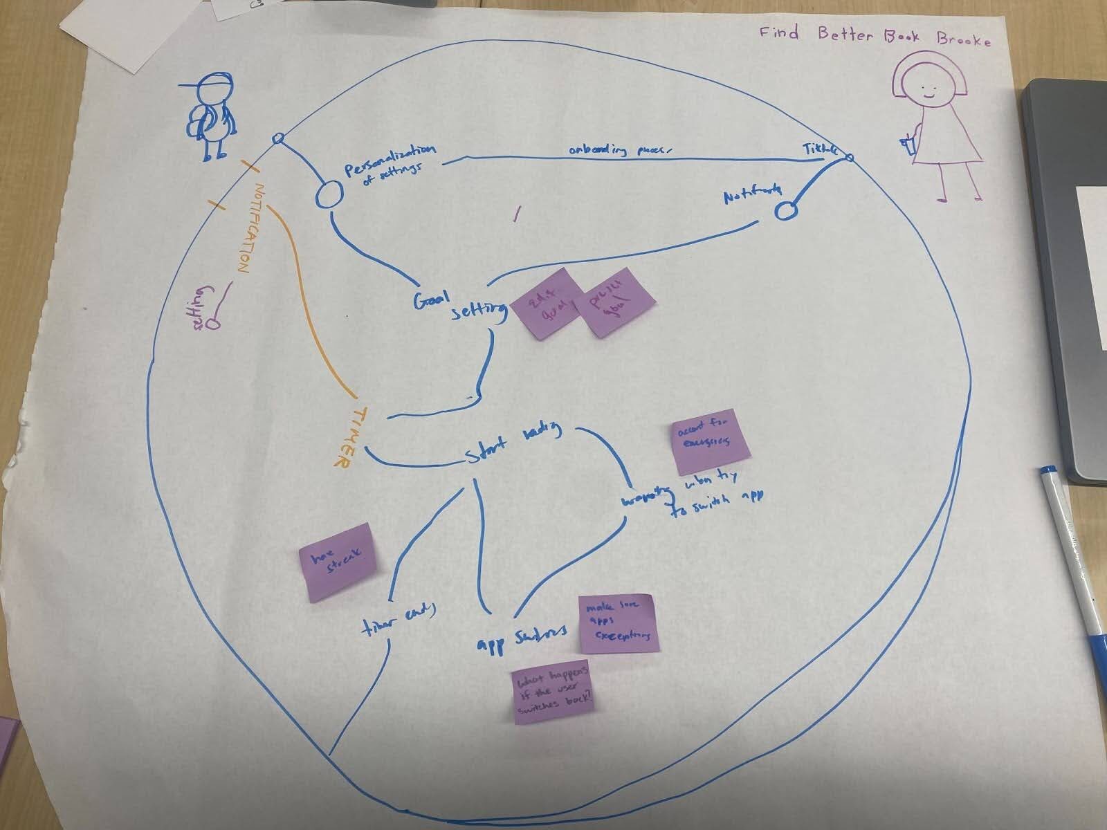 - Iterating through the system path (AKA the addition of sticky notes): Since we had spent the first part of the diagram creation on parts where our persona’s paths aligned, we decided to think about points where they diverged a bit more. This meant that we would expand on our system paths by including exceptions or specific use cases to each of our personas as an extension of converging points (with sticky notes). For example, although goal setting was a point of convergence for our two personas, areas where they would differ or need exceptions include wanting to possibly edit their goals after they’ve already set them. Or, for a user that FBBB who may not sure of what type of reading goal to set or the amount, perhaps she’d benefit from preset goals that align to her specific needs, which the system can provide. The same logic of treating exceptions applies to the app switching process, in which different users may want stricter or looser app switches. For example, if a user were to want “lose” restrictions, they would be able to more easily bypass the app switch, whereas users that want harsher restrictions may have to complete a puzzle to bypass the switch.