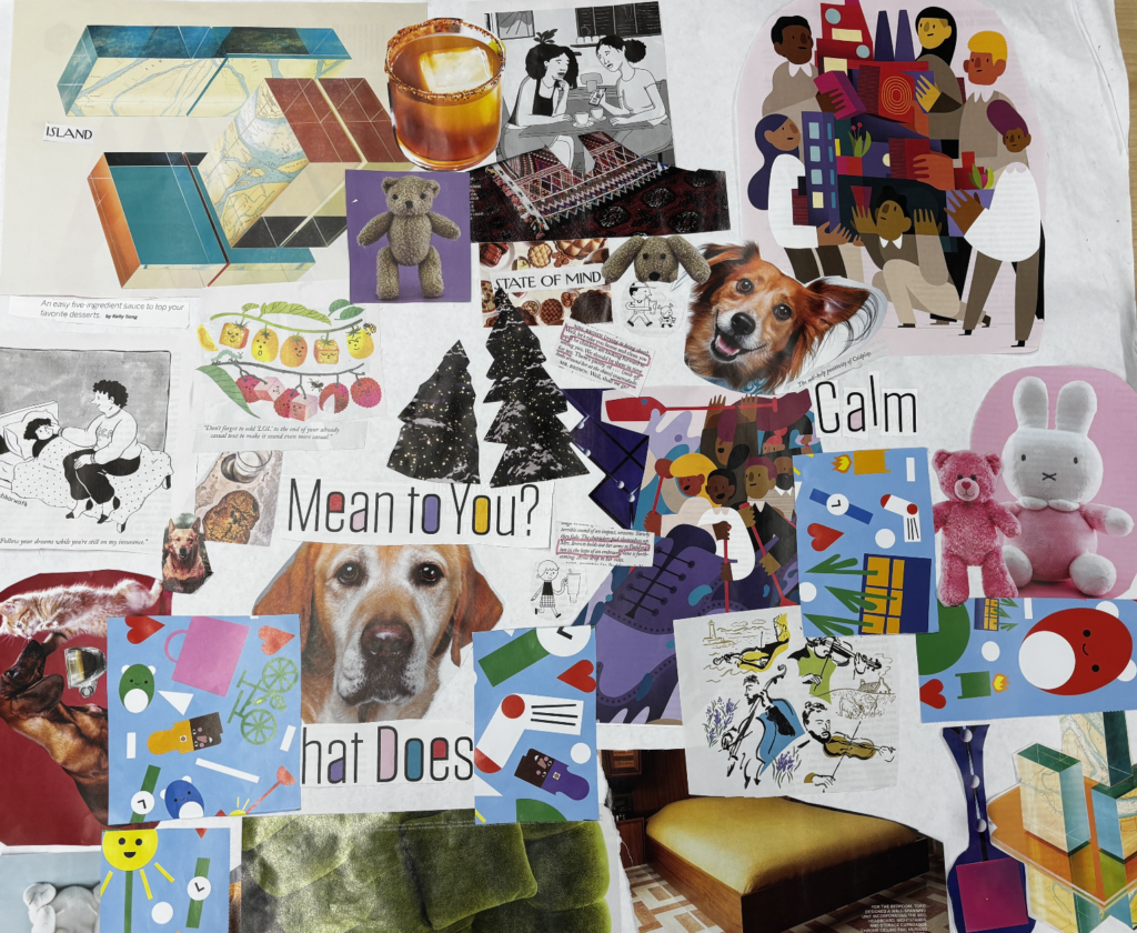 Justification: We want our application to feel readily accessible to everyone, fun, soothing, calm, and structured. We chose images that elicit comfort and tranquility. We wanted our app to feel like a hug. Calm, accessible design is how we want our product to feel. That is why we included stuffed animals, comfortable furniture, warm rugs, dogs, wholesome interactions, and happy sunshine. It is for everyone to use. We also wanted to have a pleasant color palette that was not overwhelming, but gave the app a kind, soft, personality. Most of our users have anxiety and self-image issues, so comfort is an absolute necessity for the feel of the app. We also want our users to feel like our app is trustworthy, which necessitates clean, organized design.