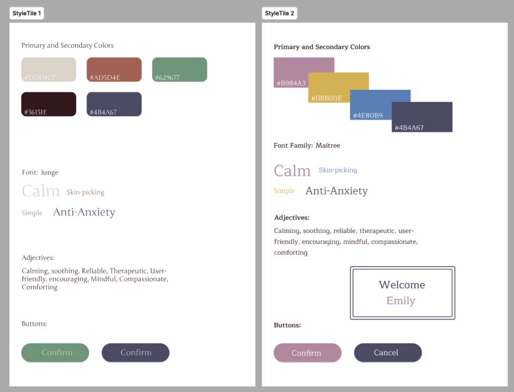 Justification: For our style tile, we selected a font that we would typically associate with comfort like a spa or massage place. We also chose a soft color palette to ensure that we do not overwhelm our users. Many of the times our user opens our app, they will already be feeling stressed and overwhelmed. Therefore, we chose soothing colors and a calming style tile. We tried 2 different styles: one that is more professional and one that is more approachable. We will decide between a muted color palette so as not to overwhelm the user or a brighter, friendly palette to seem more approachable as according to our mood board.
