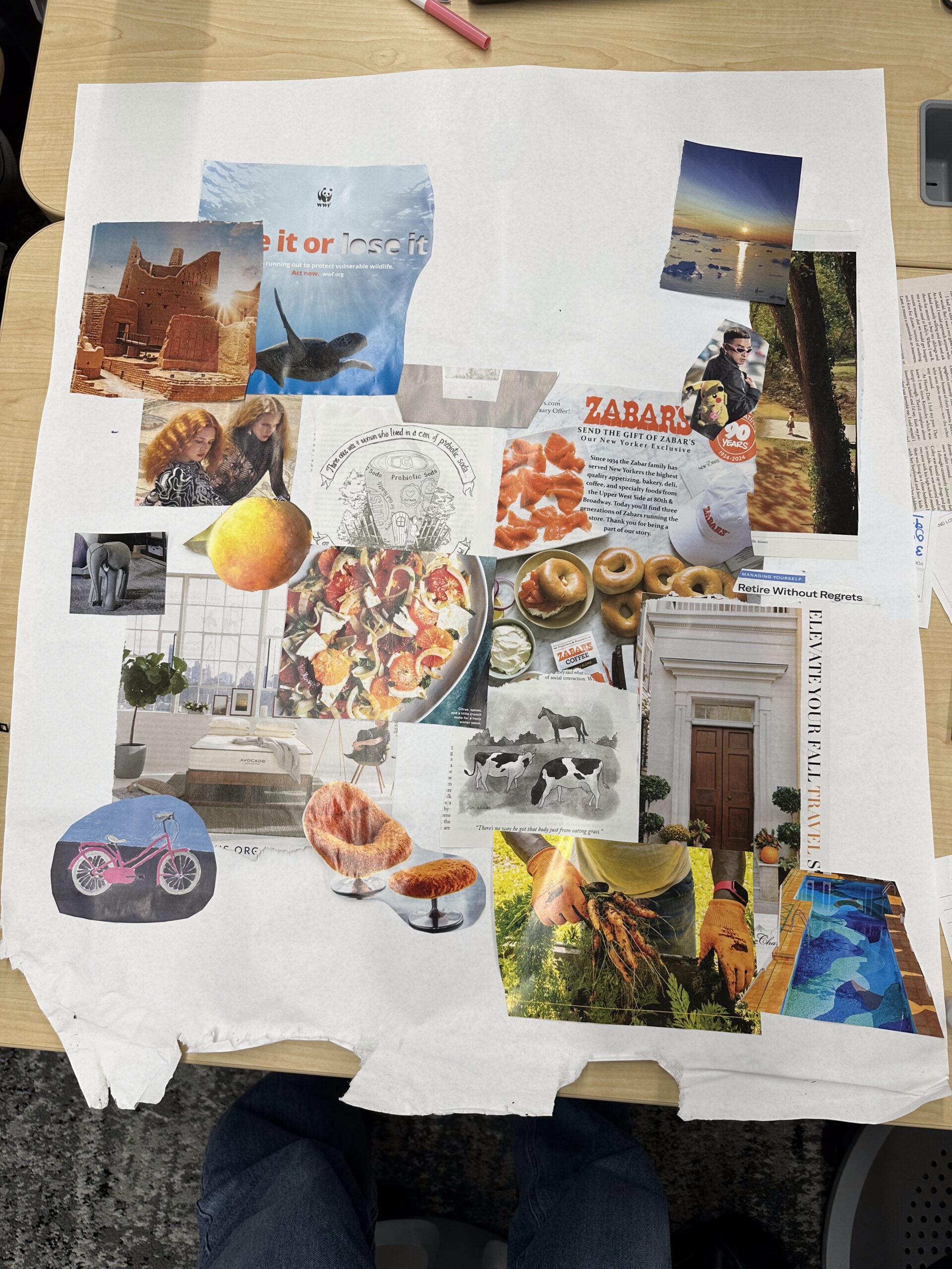 For our moodboard, we focused on channeling an upbeat and warm energy through a combination of orange (as the primary color) and blue (as the secondary color). We also brought in accents of pink. Many of the cutouts feature the outdoors and sunlight in different forms: sun rays, sun reflections on water, natural light from windows, sunsets, sun through leaves. Moreover, we used a health-conscious theme, picking foods like bagels and fruit salads that channel our brand’s city, Los Angeles.