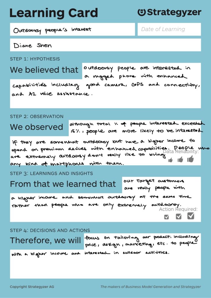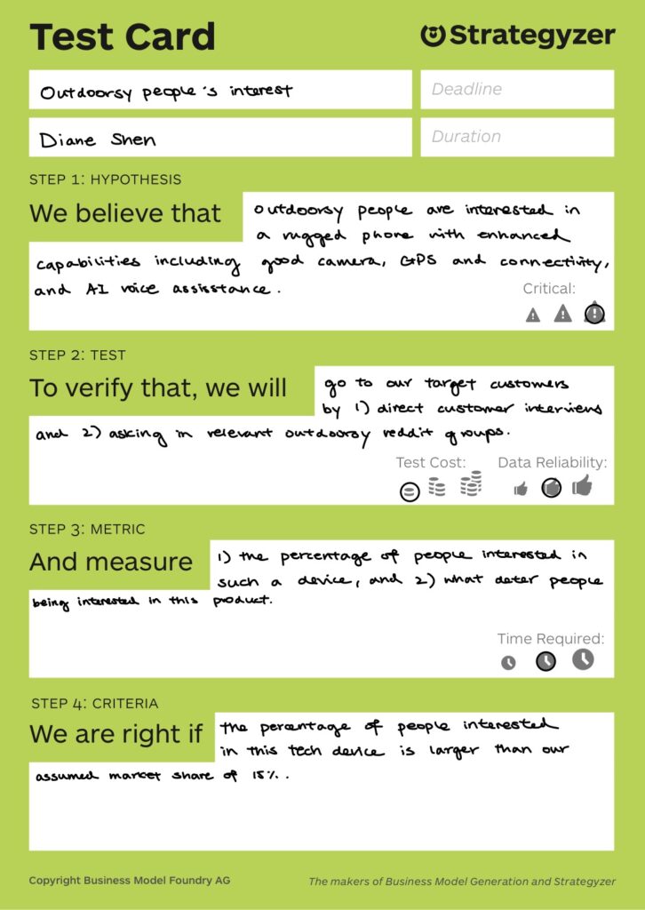 The assumption I am testing is that outdoorsy people are interested in a rugged phone with enhanced capabilities including good camera, GPS and connectivity, and AI voice assistance. To test this assumption, I conducted primary customer interviews with outdoorsy students and family friends and asked in a Reddit Post in r/hiking and r/outdoors if people are generally interested in our product.