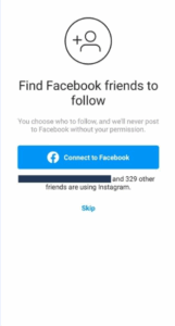 Instagram (social): Optimizes for immediate value—seeing friends. The flow pushes account creation: a quick profile (name, email, passwords, username) is all it’s needed. Alternatively, users can also log in with Facebook in one click. Then, there is the skippable page of Find friends/contacts, so friction is low and value arrives fast (feed, stories).