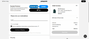 Patagonia’s checkout blends pragmatic speed(express pay options: One click through Apple Pay or Paypal) with brand trust: a simple, minimal form and payment choices that feel secure and transparent.
