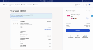 Warby Parker’s checkout flow is longer but focuses on confidence-building and customer lifetime value by requiring users to build a personalized account and enter customization details—ensuring that the delivered product is perfect for the user’s use. For example, in the user’s cart, Warby Parker details all custom selections by default so that users are confident they made the correct selections (see Figure 2) . Second, when users click “Next Step,” they’re prompted to create an account so they can enter customer details that allows Warby Parker to ensure custom fit (see Figure 3). Even though this process takes longer, the company prioritizes finding the precise fit to deliver high-quality customer lifetime value.