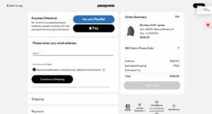 Figure 4. Patagonia’s checkout includes credentials/certifications such as “1% for the planet”