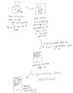 This wireflow indicates how the app flows once it has been activated by the user and the user continues to not get distracted. It includes a warning message if the user picks up their phone and tries to navigate away from the app since we believe that the user should be given a chance to rectify their behavior once they start to stray. Furthermore, over time this repetitive nudge would condition the user to avoid picking up their phone when they are trying to stay focused. (Anjali)