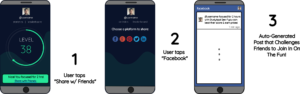 In the wireframe below, we have an intro panel that shows their level (xp earned by focusing) and an announcement (toast) about their achievement of studying for 2 hours. The user is then prompted to share with their friends. After they tap the share button, they can select the social media platform they want to share it to. Our server will then automatically generate a social media post for their account that announces their score and challenges friends to join in on the fun. We believe that this will allow us to snowball and create an engaging environment where users will want to compete and use our product with their friends. (Ellington)
