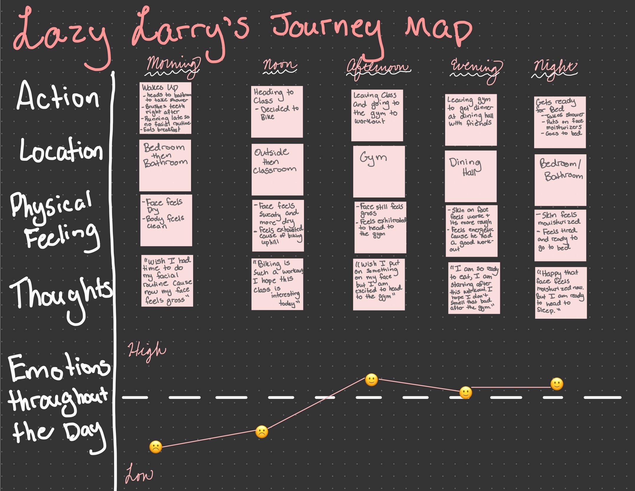 Meet Larry’s journey map during one day during the week. This day he wakes up and is running a tad late so he only had time to take his shower, brush his teeth, and eat a quick breakfast. However, when he does not put anything on his face, his face feels dry which he does not like the feel of it. While he is out he does wish that he did put on moisturizer or something on his face so it does not feel dry. He also goes to the gym and even during that moment his face feels worse and is wishing he wasn’t lazy and was not running late to put on his moisturizer. At the end of the day he takes a shower and finally puts on moisturizer which he feels much better about.