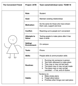 The behavior persona I created is The Convenient Friend. This person is prone to only maintaining their relationships when it is convenient for them—such as when they run into someone spontaneously. They will also make less of an effort to reach out after certain setbacks since the process is not smooth, such as if there are scheduling conflicts or if the other person does not reciprocate.