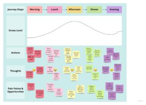 This journey map catalogues a single day in the life for “Anne.” I chose to track her stress level, noting when decisions had an impact on that level.