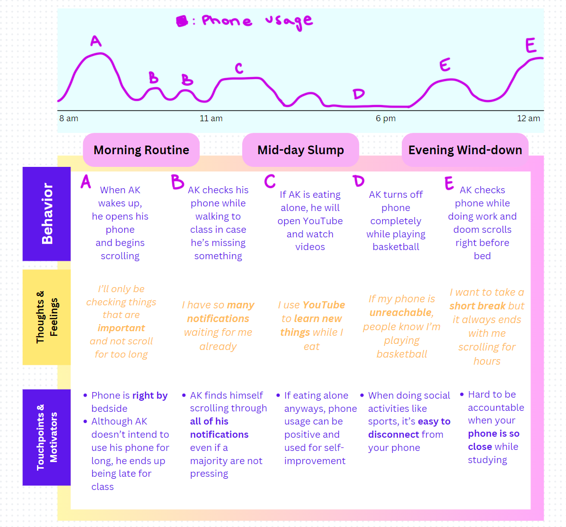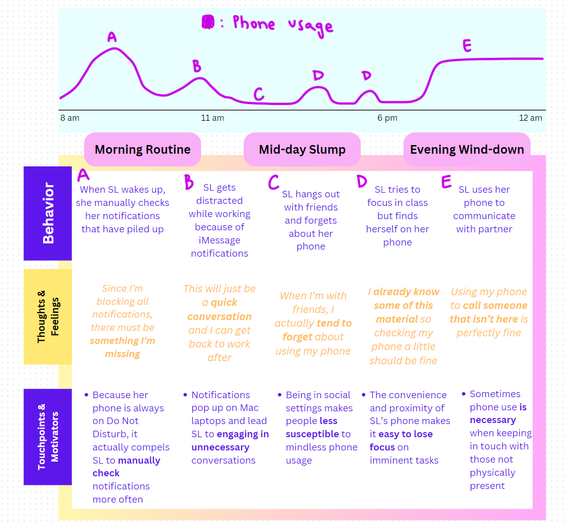 The Journey Maps that I created follow the general structure of behavior, thoughts/feelings, and touchpoints/motivators. Each of these groupings has a corresponding graph point that shows their phone usage amount based on the circumstances. The quotes and touchpoints are taken from interviews and inferences from group discussions.