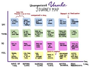Brief Overview of Journey Map: My journey map walks through unorganized Ursula’s day. The time is split up into different times in the day. Some important highlights include when Ursula’s feelings change throughout the day from fine to anxious. Another insight is that she has a moment of realization that she forgot that an assignment was due, a result of putting off work and not knowing what she had to do that day.