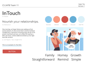 Isabelle’s reasoning: “To make the feel of our app welcoming and easy-to-navigate, I picked Gaegu as the header font and Varela Round as the paragraph font. Gaegu felt whimsical and friendly, which is in line with our app’s goal of non-judgmentally helping users keep in touch with their family more. I chose to switch to Varela Round for paragraph font to make it easier to read, and because Varela Round felt more open than traditional sans serif fonts like Arial (the font of this paragraph). I picked a dark orange as the main color our style tile because it’s unique and reminds me of fall/warm lattes/fuzzy sweaters, all positive symbols that are often associated with warmth and family.”