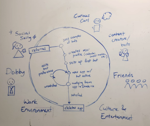 Our system path focuses on the journey of our main persona, Social Sally. As a social butterfly, she encounters the product through a referral by friends. The resulting flow details her journey with our product, from finding out about it to deleting the app once she has changed her behavior to her liking.
