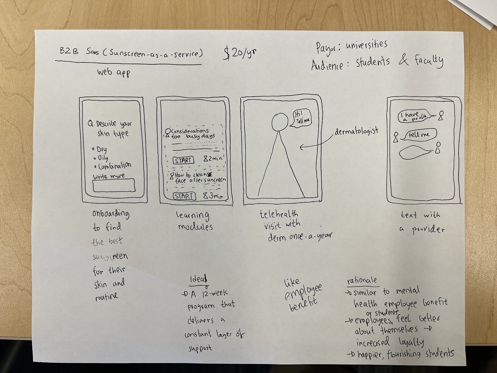 - B2B SaaS (Sunscreen-as-a-Service): In our previous steps, we discovered an issue of sunscreen-related skin problems (both medical and comfort-wise), which gave us the idea for a digital health product. The payor will be universities like Stanford/Stanford-sponsored-insurance and users will be students and employees. Users will then be able to This is a similar model to Meru Health (Stanford is their customer for its employees). There will be an onboarding page whereby users can use a screener to give us information about their skin type and sunscreen use. Then we will have asynchronous learning modules for different personas. There will also be a telehealth component where a clinical provider uses the data from the onboarding and then a conversation (either call or text) with the the user to recommend an appropriate sunscreen and address any related concerns.