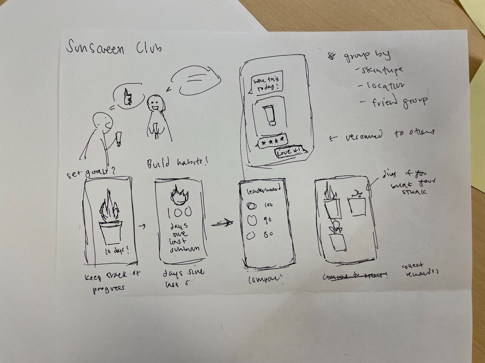 - Sunscreen club: In our studies, we noticed that participants were interested in knowing what products other people were using. This led us to coming up with the idea of a sunscreen club, where you can see what sunscreen products your friends use and you can recommend products to others.
