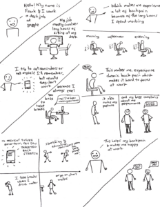 From the personas and journey maps, we created a storyboard that follows Frank (not to be confused with New Grad Frank—this is a different character) as he tries to get up more and take more breaks at work.