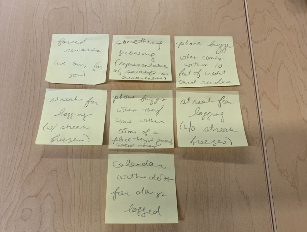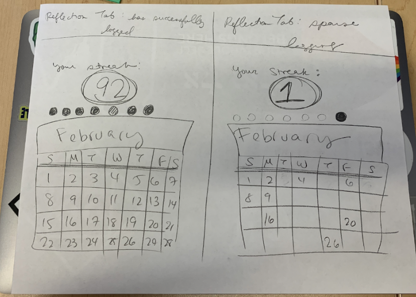 With the main functionality of our app corroborated by our intervention study, we moved on to investigating different implementations that might help users stick to using our app. We explored various solutions, including an anthropomorphic representation of continuous login, streaks, and a calendar overview. Through the last exercise (paper concept sketch), we decided that these features could likely work in tandem and can be pursued simultaneously.