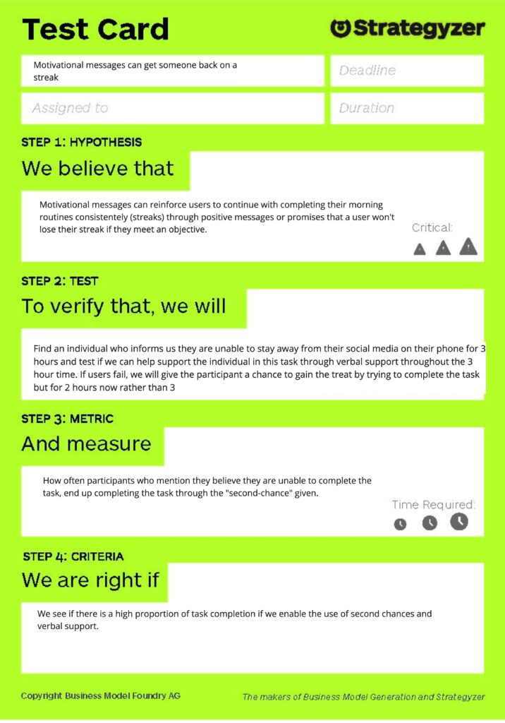 We picked two of the assumptions that fall in the important and unknown quadrant to create assumption tests for – motivational message can encourage someone to get back on track with a streak, and pausing for 15 seconds before going on an app will lead user to not go on the app.
