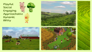 Justification: I chose to explore the “farm” theme because it mirrors the playful, community-driven nature of our solution. A farm came to mind as a living ecosystem in which diverse contributors—animals, plants, and farmers—coexist and coordinate to sustain shared growth. This directly mirrors the social environment we are designing for, which is composed of multiple personas with unique behaviors, needs, and roles.
