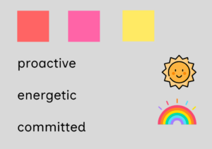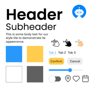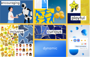 Looking over our individual mood boards, we realized that we had each visually highlighted very different aspects of our solutions, so we got back together to make an entirely new collective mood board. We wanted to highlight the playfulness of our solution, since much of it hinges around a social “bot,” and we wanted to be specific about the personality and energy of our bot. Although our solution relies to a degree on nudging and pressure, we wanted to ensure that it was fundamentally encouraging in nature, promoting curiosity rather than punishment. We decided to anchor these choices in blue and yellow colors, and created the following mood board to capture them.