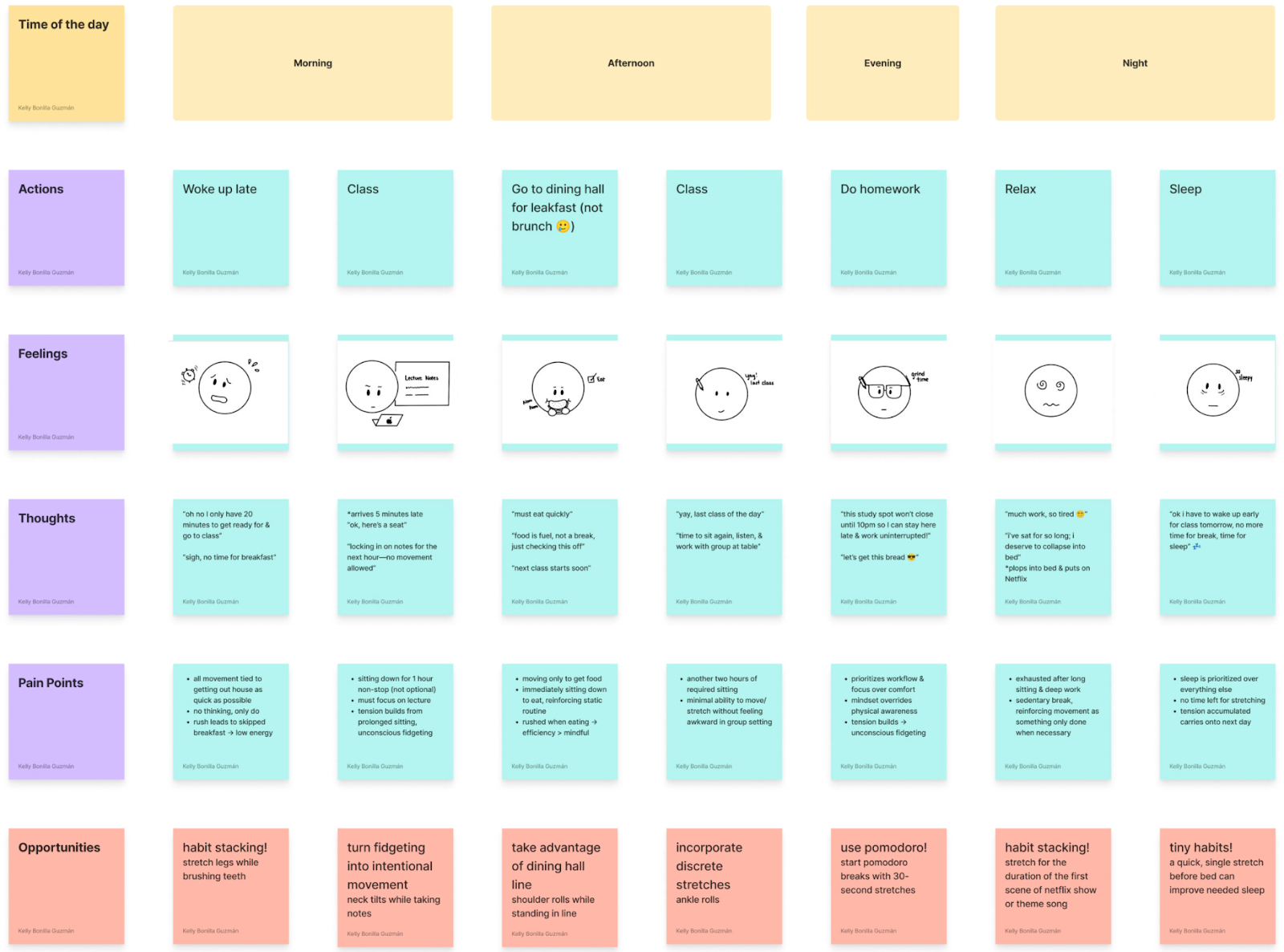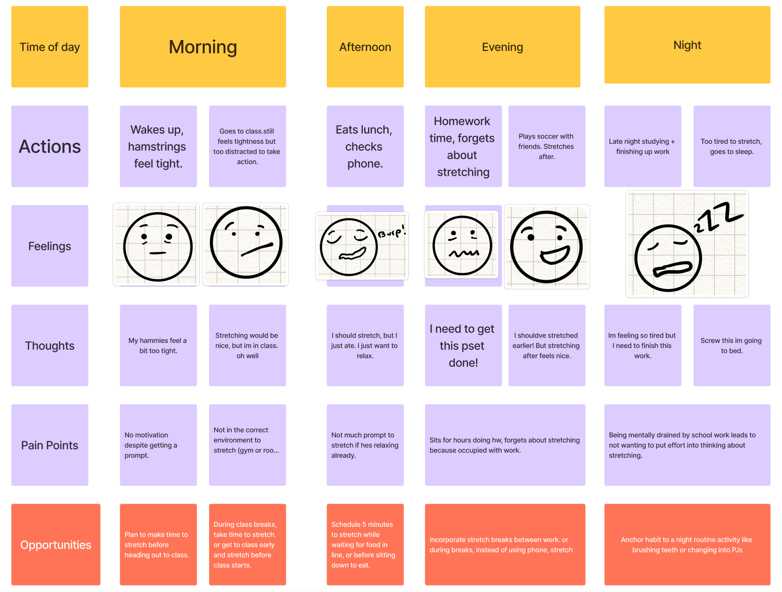 Through the process of collecting qualitative and quantitative data from our participants (from diary study entries to pre-study and post-study interviews), we aimed to identify the patterns and behaviors that motivate or deviate students from incorporating the habit of stretching into their daily routines.
