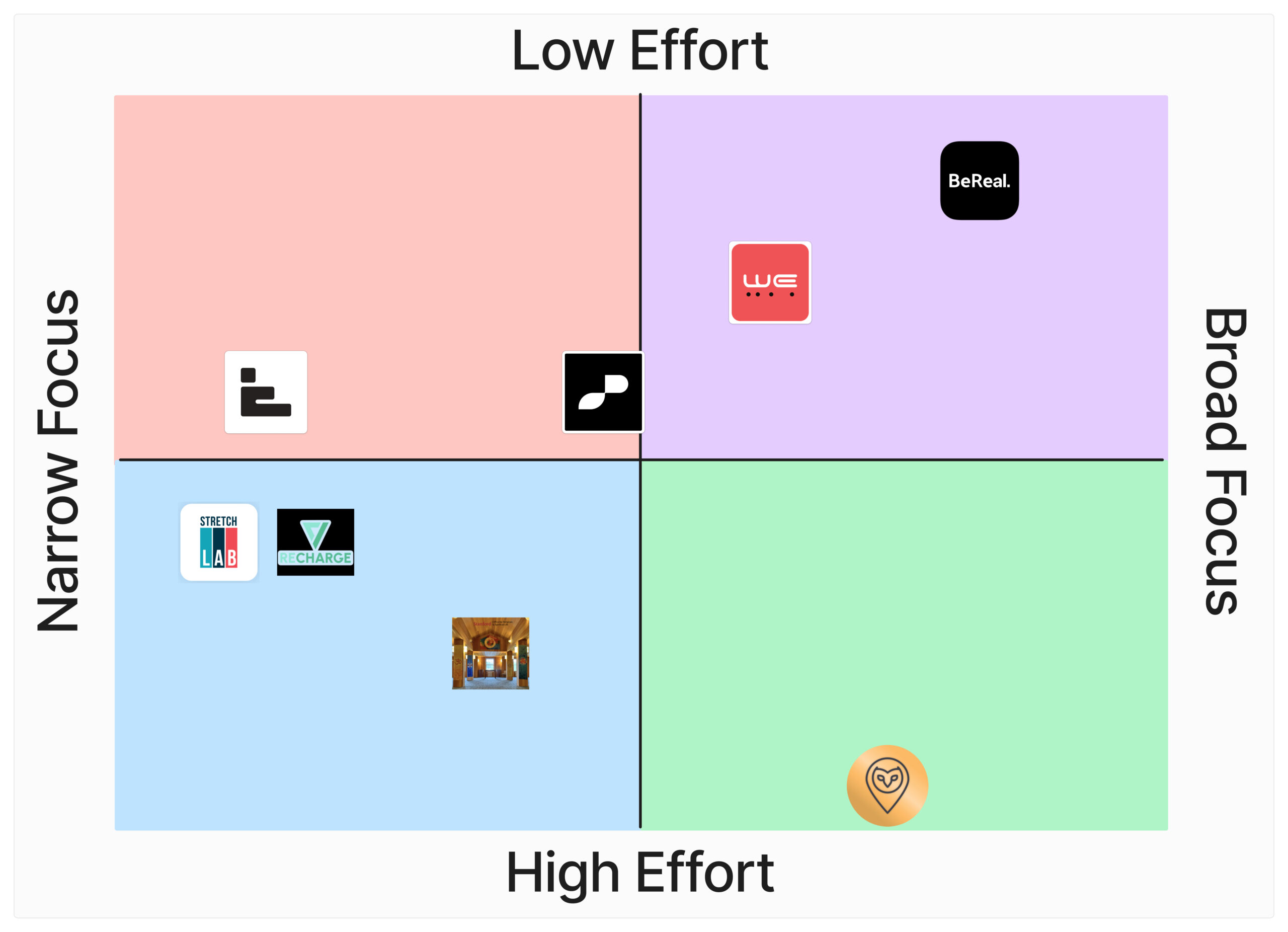 - Low-effort, broad apps (e.g. BeReal, WeStretch)