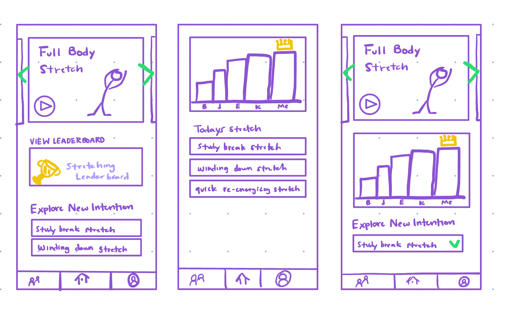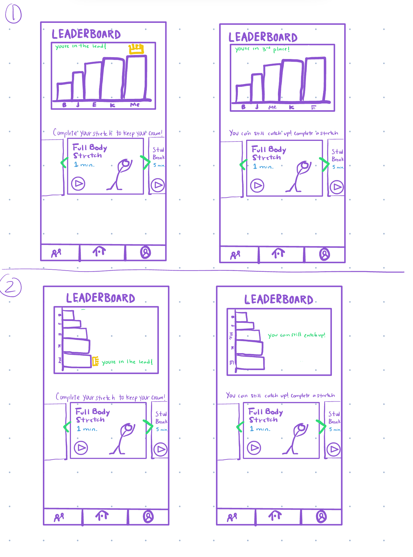 For my final sketch, I prioritized showcasing the leaderboard and a quick encouraging call to action to get the user to complete a stretch. My original sketch tried to encourage the user to do their sketches, but as a teammate mentioned, the screens had alot going on that it was a bit difficult to determine what the user was supposed to do. I restructured the homepage sketch such that the leaderboard is now at the top and depending on the users position in the leaderboard, they get a message that will encourage them to continue stretching or to stretch to catch up. In both cases, the screens focus on emphasizing social forces to drive a user like Shame Shawn to complete their stretch.