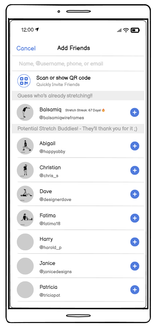 We’ve updated the friend-adding flow based on the teams suggestion, replacing the “i” symbol with one that implies “adding.” To enhance personality, we’ve incorporated stretching elements into grey profiles, section headers, and profile images. The “Contacts to invite” section now has engaging labels like “Potential Stretch Buddies! – They’ll thank you for it ;)” or “Guess who’s already stretching!!” instead of the generic “Contacts using app.” These changes create a livelier, funnier, and more approachable atmosphere. As a final touch, we’ve added a feature displaying an existing friend’s current or highest stretch streak, reinforcing our social motivation emphasis.