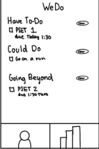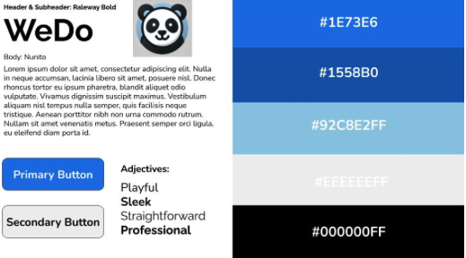 Breaking down our Style Tile, the fonts we selected were Raleway Bold (Header/subheaders) and Nuninto (Body). These fonts were selected on the principle of emitting a playful, sleek, and professional vibe. Our color selection is a range of shades of blues. We have our main color as a bright blue to draw attention. In contrast, we have a lighter blue to be more fun. Likewise, we have a darker blue for potential subheaders, offer contrast from our bright blue, and evoke a professional feel. Lastly, we have a greyish tone for secondary buttons and black/white for all the words. This color scheme, we believe, best represents the essence of WeDo.