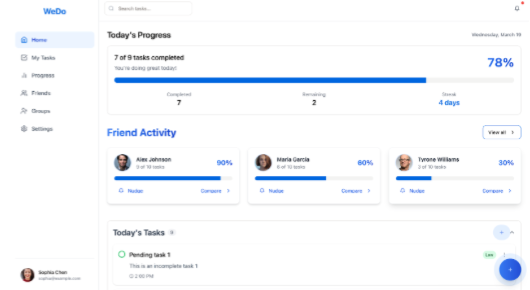 - Our final prototype encapsulates many MVP features and core interactions. For example, once signed in, the interface prominently features an enlarged plus button—making it effortless to create tasks—which, along with automatic sorting that moves completed tasks to the bottom, ensures a clutter-free task management experience. Additionally, the prototype incorporates group functionalities where users can invite friends, compare progress, and even send nudges, helping to reinforce the social accountability aspect of our design.