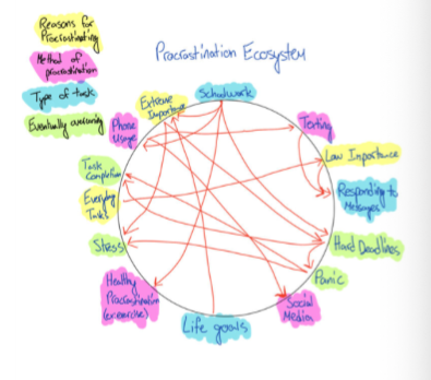 In this model, we created a procrastination ecosystem which highlights a handful of the factors that go into a typical process of procrastination. This was largely inspired by grounded synthesis 4 which seemed to represent a common pattern for most of our participants – believing that it will “get done” eventually, giving them the confidence to start things late. It starts with some type of task that is put off, either because it is too difficult, too boring, or just not that important. From there, many different distractions can aid in procrastination. Eventually, procrastination will end as the individual finally completes their task. There is usually a specific cause for their sudden completion of the task – often a deadline that brings about stress or panic for the individual, finally moving them to action. This diagram shows how similar processes of procrastination come about for different types of tasks, indicating that often it does not actually matter what is being procrastinated, as individuals become so accustomed to that way of operating.