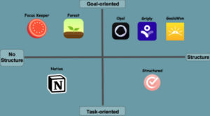 - Focus Keeper and Forest (No-Structure + Goals) encourage focus through Pomodoro timers and gamification but do not provide structured goal tracking. These intervention applications are ideal for highly motivated goal oriented individuals who need a push to get started. Either social accountability or gamified time pressures helps to empower their willingness to achieve their goals.