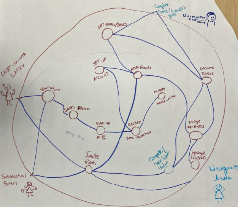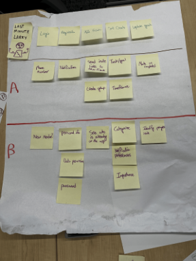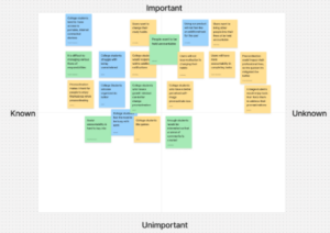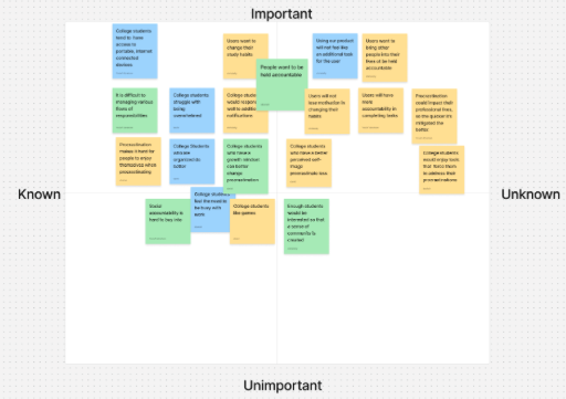Following our experiment, we intend to synthesize insights from the data regarding stress, social interactions, and productivity in relation to procrastination. We started with Affinity Grouping to flesh out and organize all the different data points we covered across our interviews. Below you’ll see a picture of our first Affinity Map, as well as a bulleted list of our largest takeaways following the mapping session.