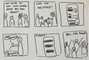 - There is a strong social influence on task initiation. When students observe their classmates discussing an assignment or making progress, they feel pressured to start their own work to avoid falling behind. Conversely, if they perceive that their peers are also procrastinating, they feel less urgency to begin. This was evident in one participant’s case, where she stated, “Once I found out that my peers had already finished most of the assignment I decided to skip lunch to work on it because I suddenly felt like ahhh… I’m falling behind.”