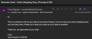 We had nine participants take part in our five-day baseline study that ran from 1/22/2024 to 1/26/2024. Participants each had access to a diary to fill out via Google Sheets (view template here) and were instructed to fill out an entry every time they finished an online shopping session, whether they had only browsed or they had made a purchase. They received a reminder to fill out their diary three times per day—at 8 AM, 12 PM, and 8 PM—via email. See one such reminder below.