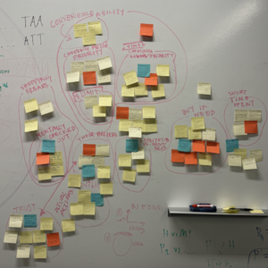 Each team member wrote sticky notes for 1-2 participants from our baseline study – extracting critical points from the pre-study interview, diary study, and post-study interview. We chose to write sticky notes for individuals we personally interviewed so that we could reference the expressed body language, emotions, and facial expressions. Due to the overwhelming number of sticky notes generated, the team decided to start with an affinity map where we grouped notes with aligning thought processes or beliefs. The resulting groupings were made with the perspectives and motivations of the participants in mind: